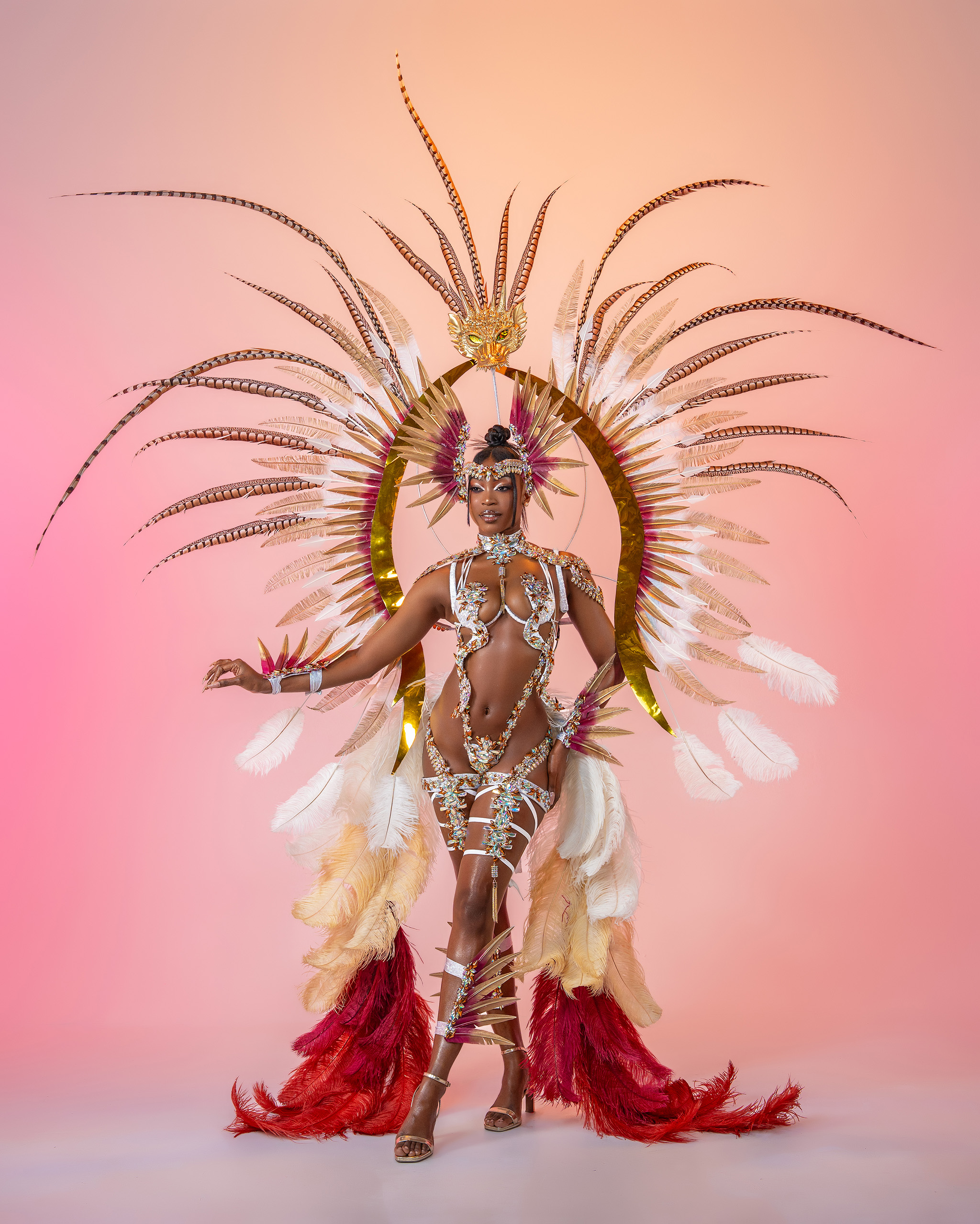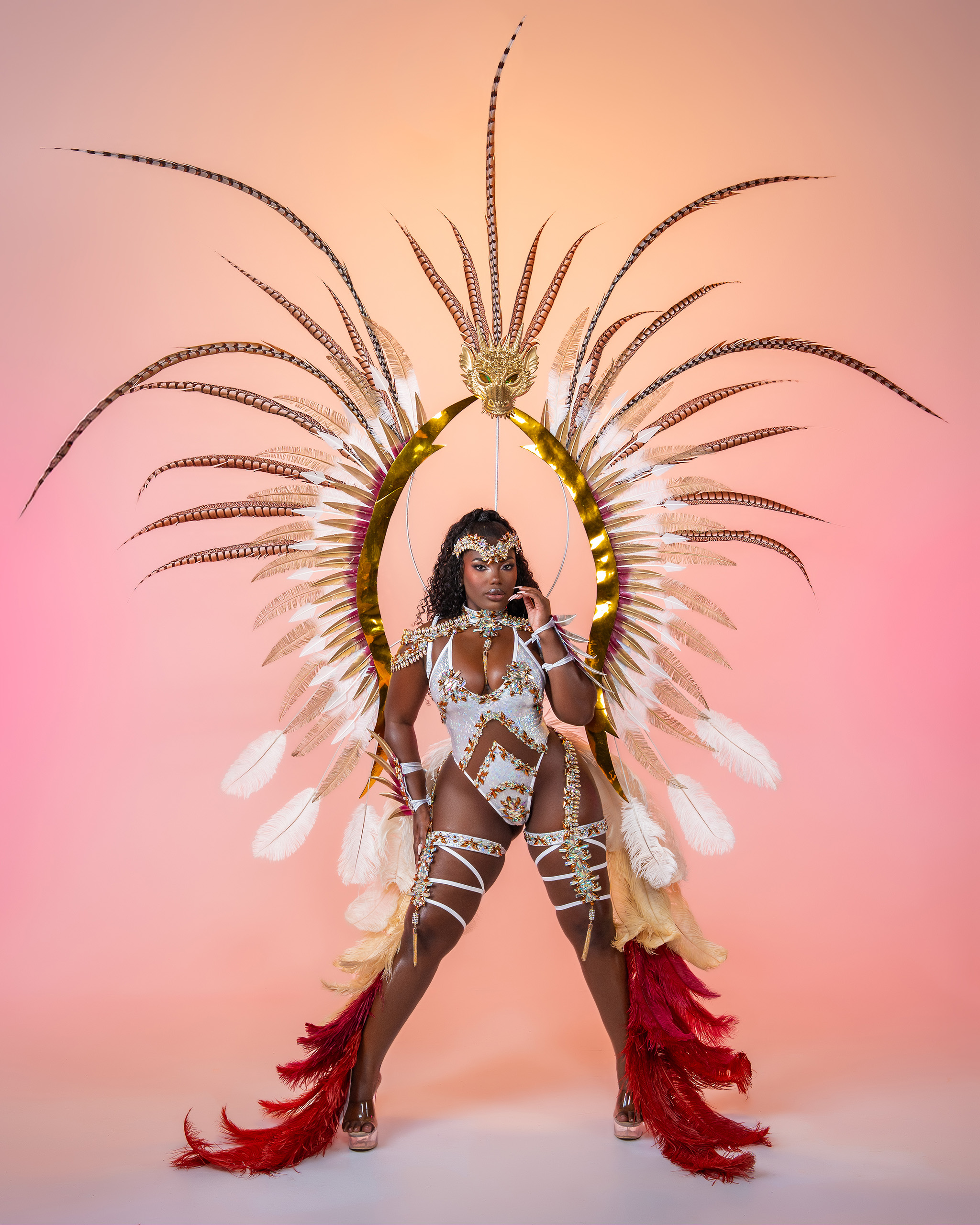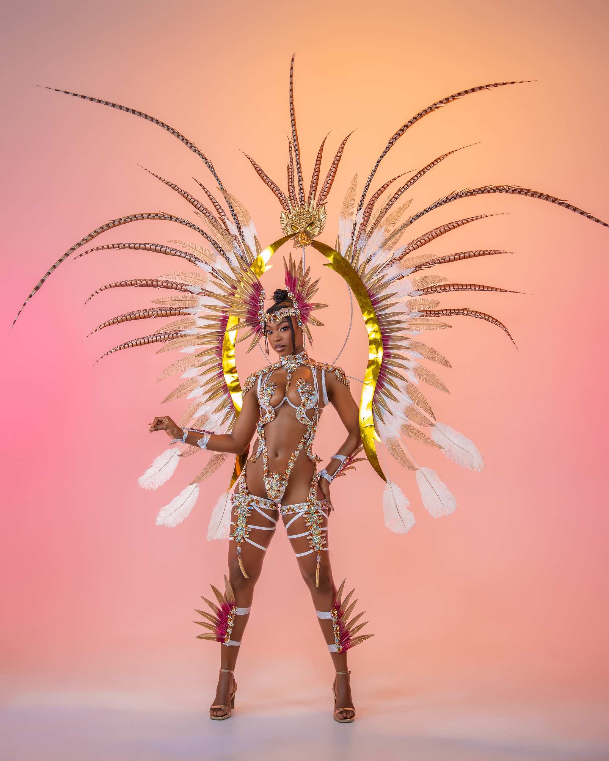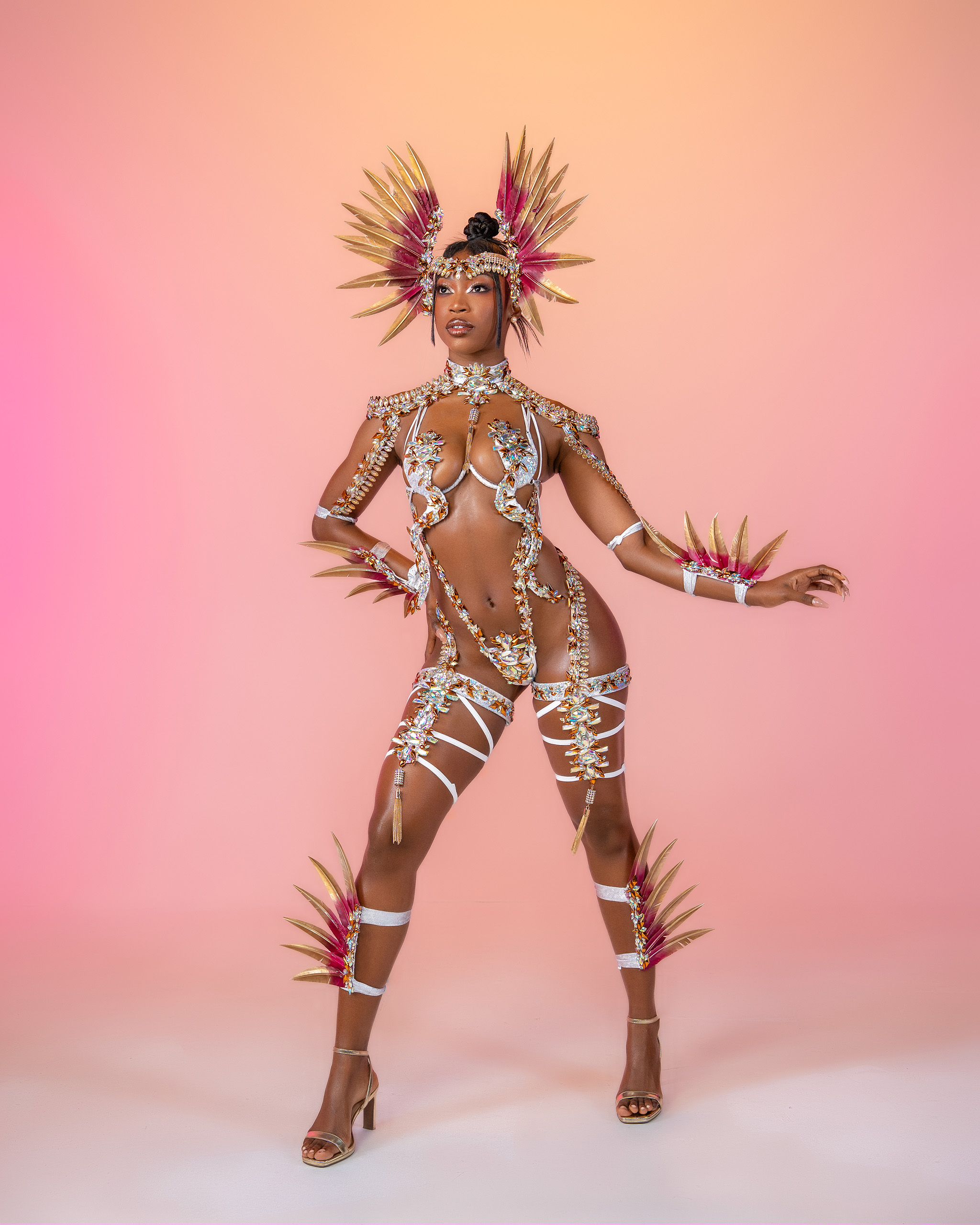 Includes: Large Feathered Headpiece, Wire Bra, Frontline Bikini or Thong, Neck, Feathered Lower Arms, Upper Legs and Feathered Legs.