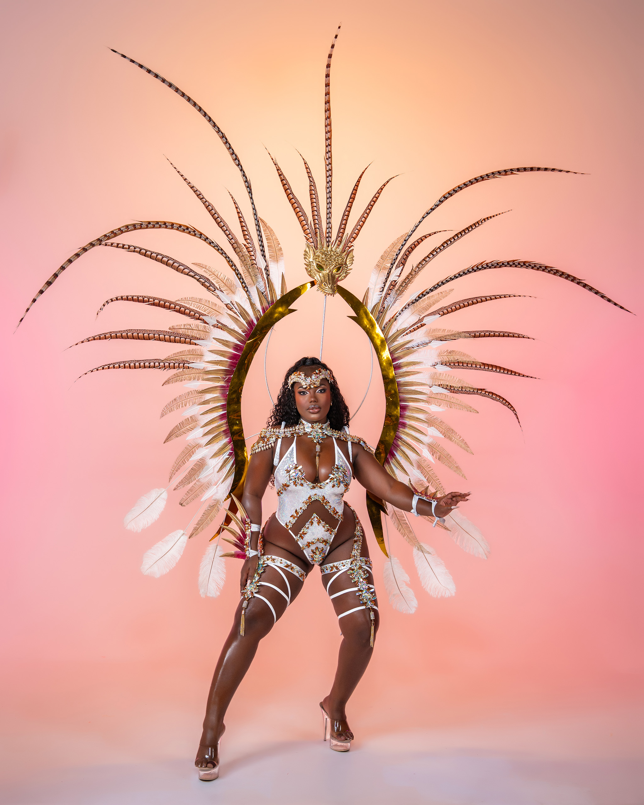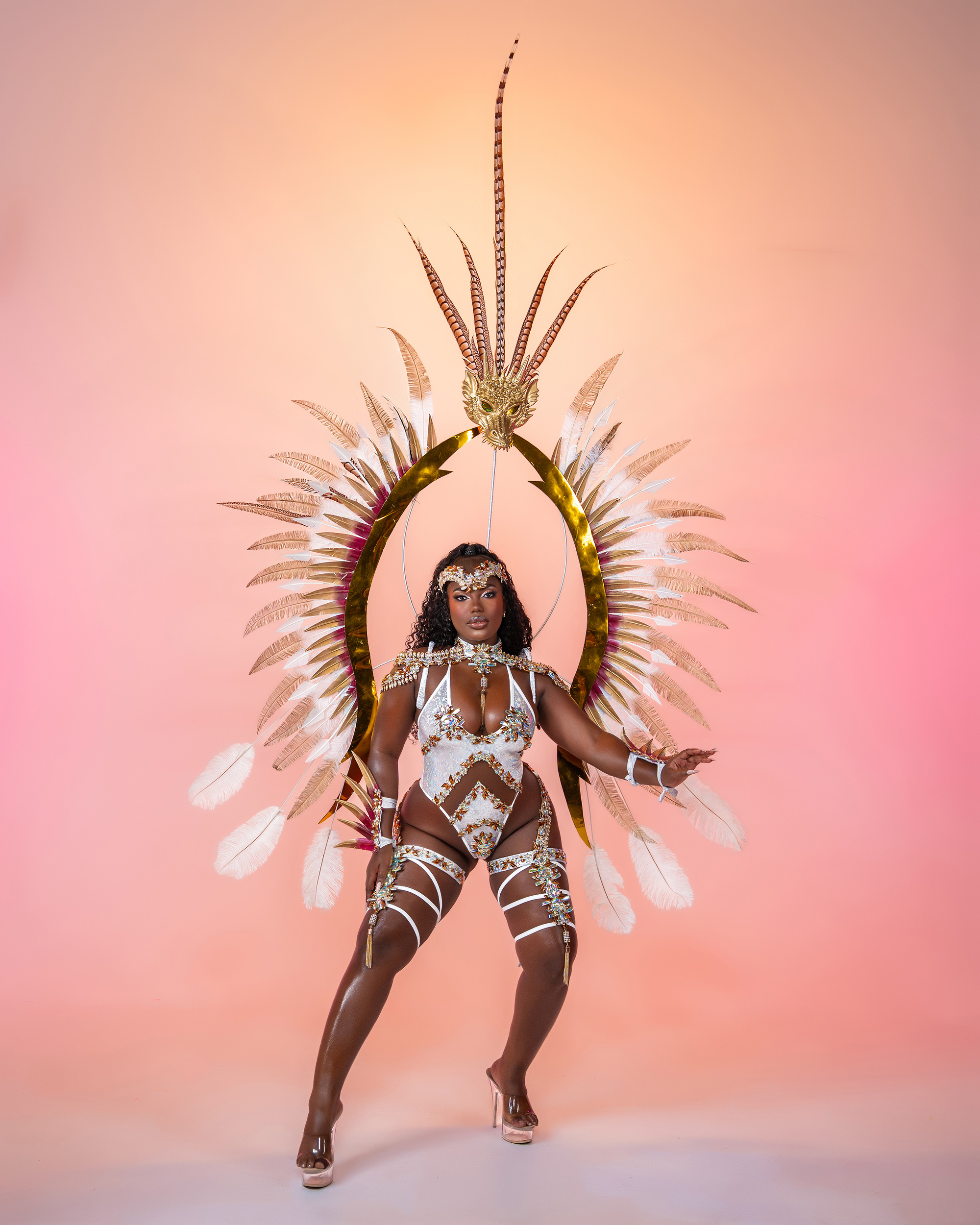 Includes: Large Feathered Headpiece, Midline Monokini or Thong, Neck, Feathered Lower Arms and Feathered Legs