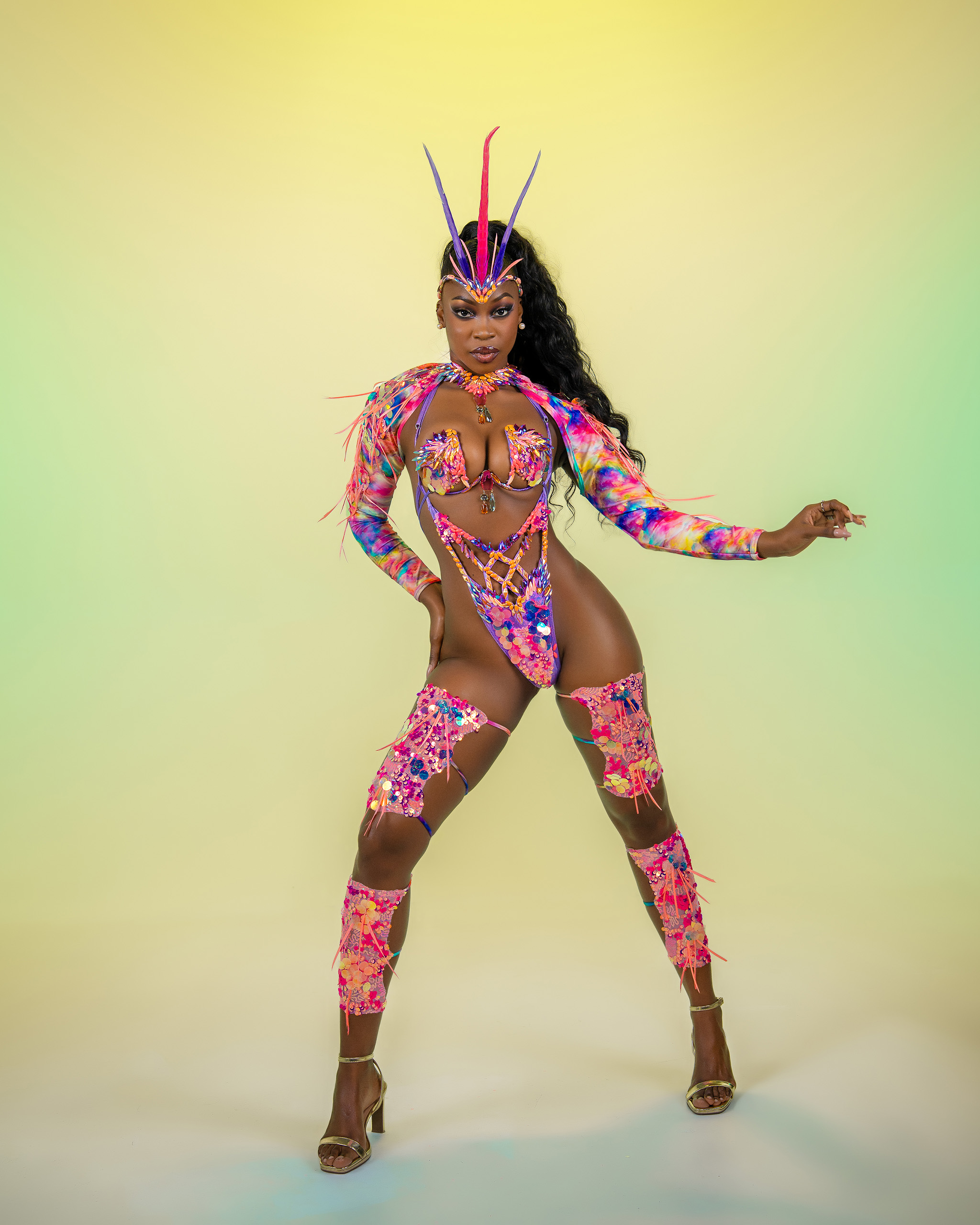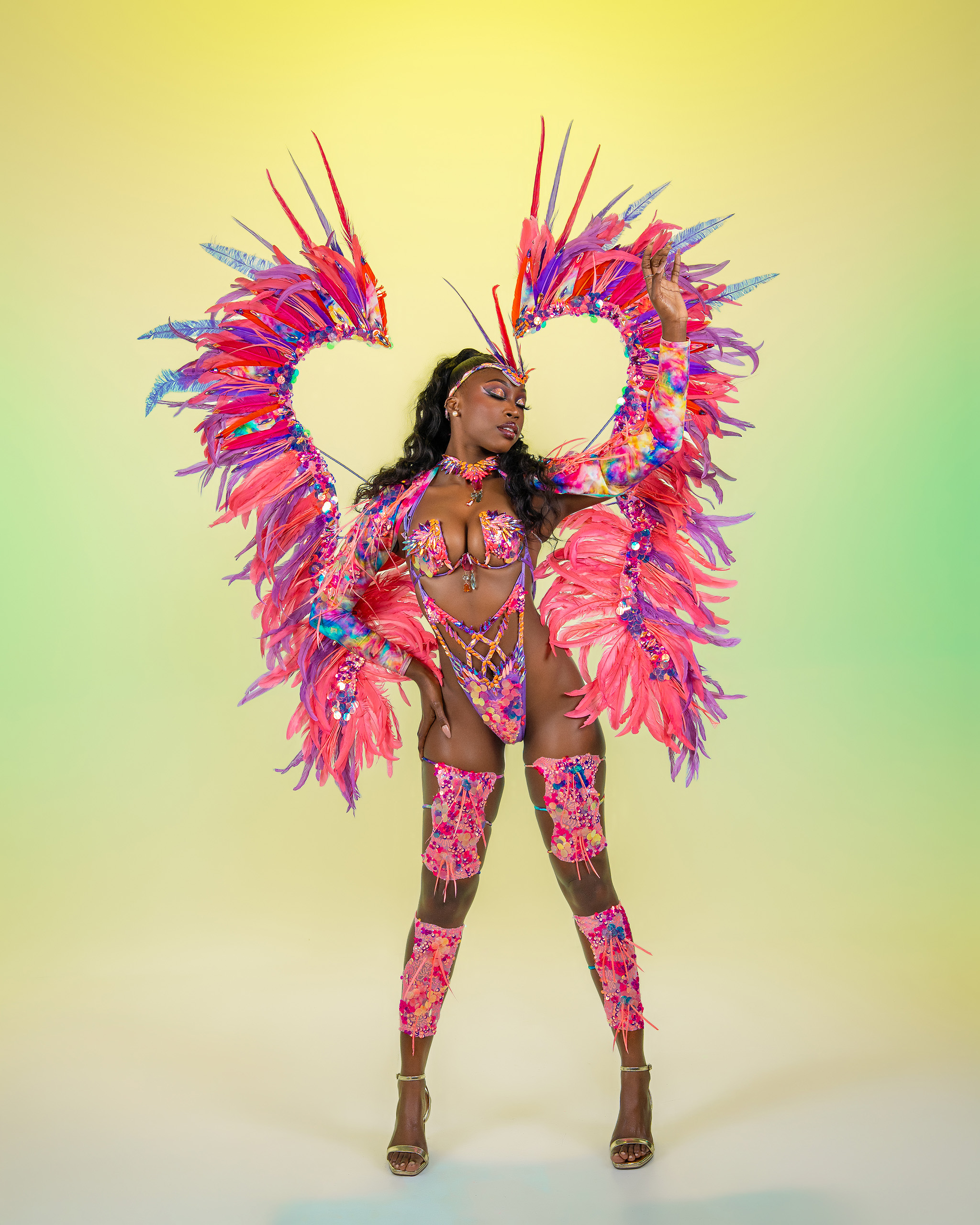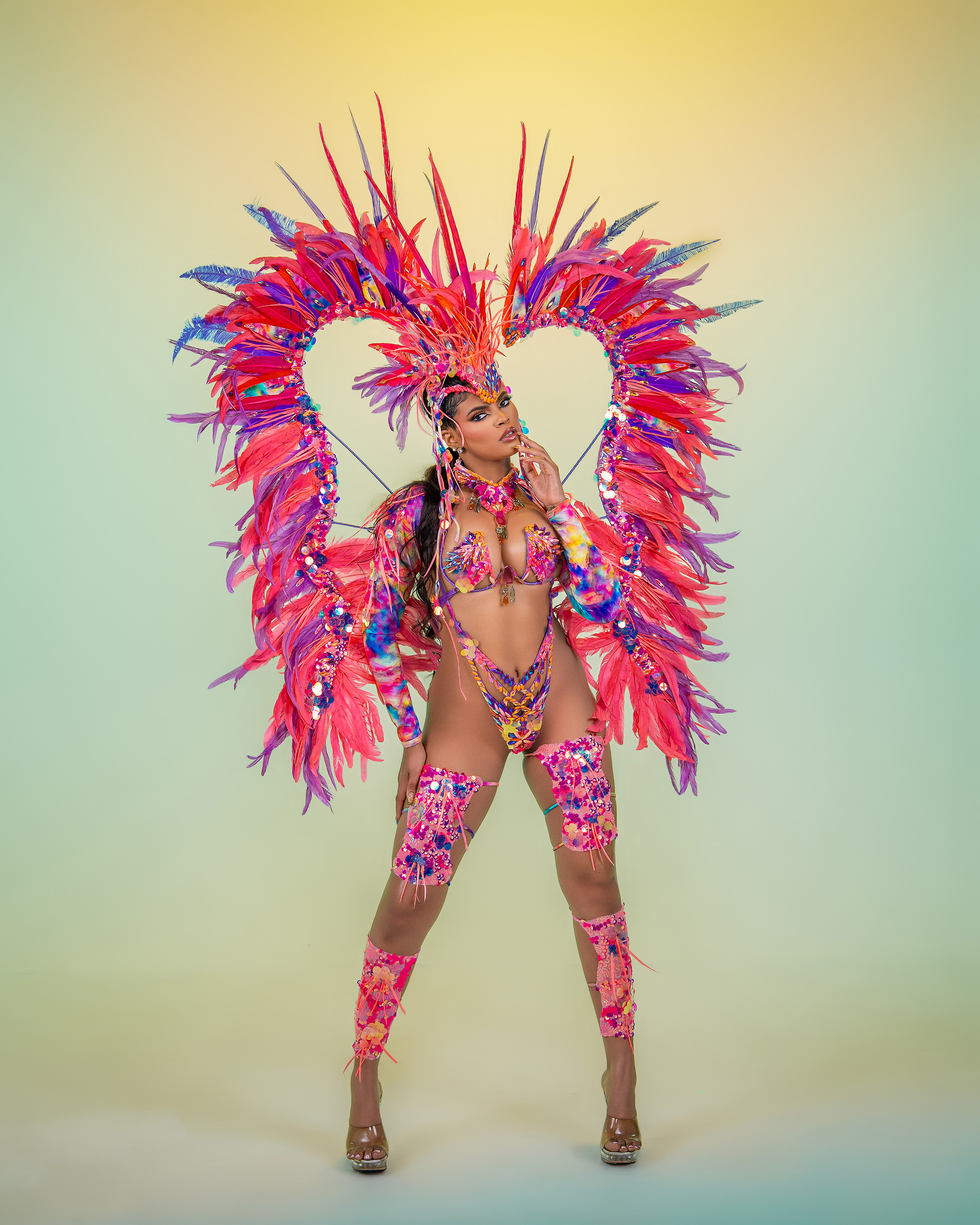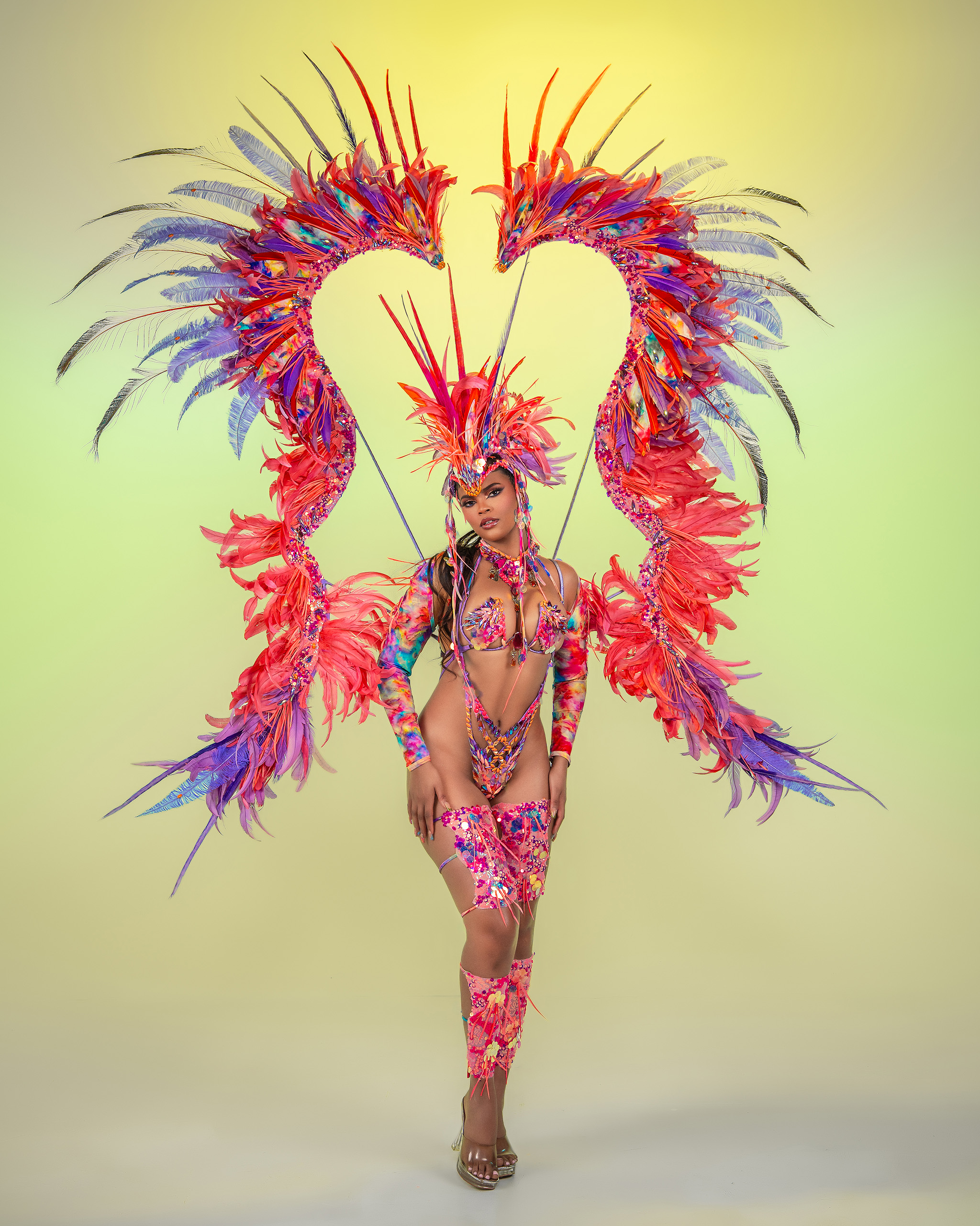 Includes: Large Feathered Headpiece, Wire Bra, Frontline Bikini or Thong, Neck, Sleeves, Upper Legs and Lower Legs.